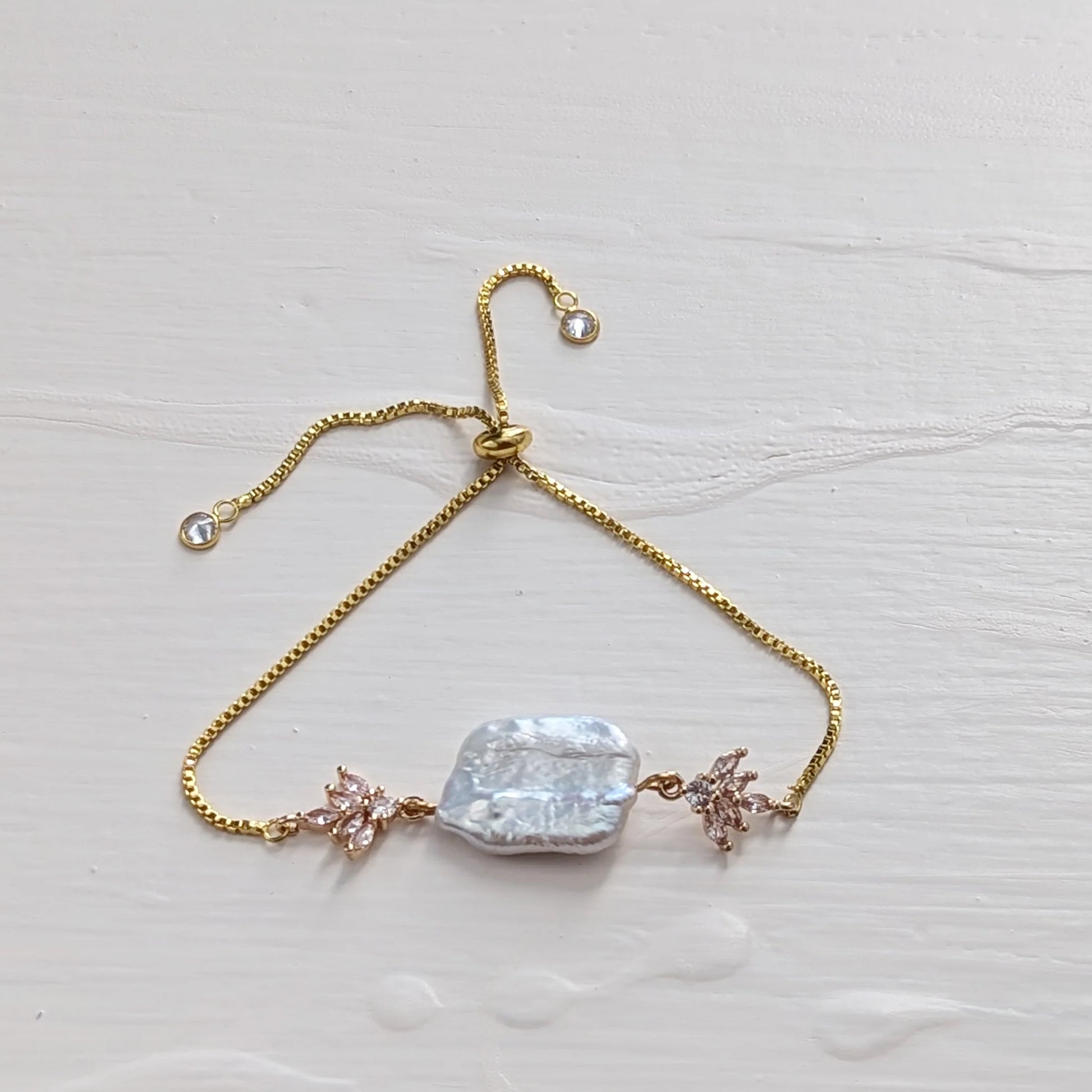 This timeless bracelet combines vintage charm with modern sophistication. It features an irregular baroque freshwater pearl (14x18mm) and delicate five-petal CZ floral embellishments, evoking the glamour of the Art Deco era. Available in gold or silver, it has an adjustable sliding chain for a perfect fit, ensuring style and comfort.