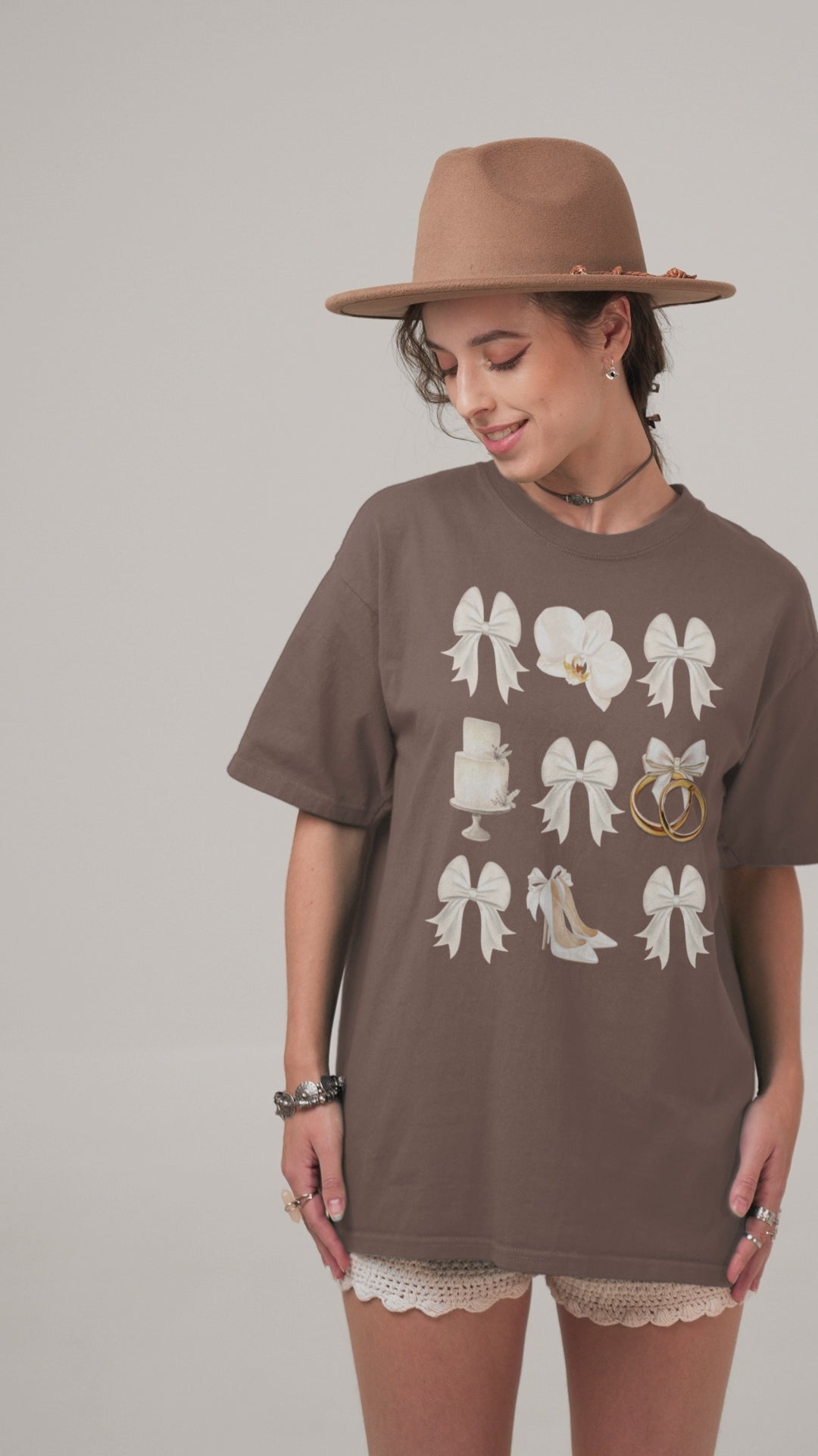 Soft, elegant, and thoughtfully designed — this Comfort Colors tee is the perfect fit for every moment on your bridal journey. It's a charming choice for the bride-to-be, featuring sweet bows, wedding rings, heels, and florals.