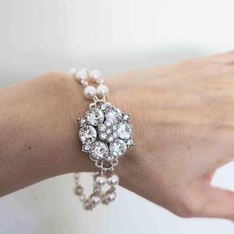This handmade bridal statement bracelet CHLOE features a vintage stamping that is used as a base for the art deco style flower crystal brooch and hand wrapped two strands of white/ivory simulated pearls