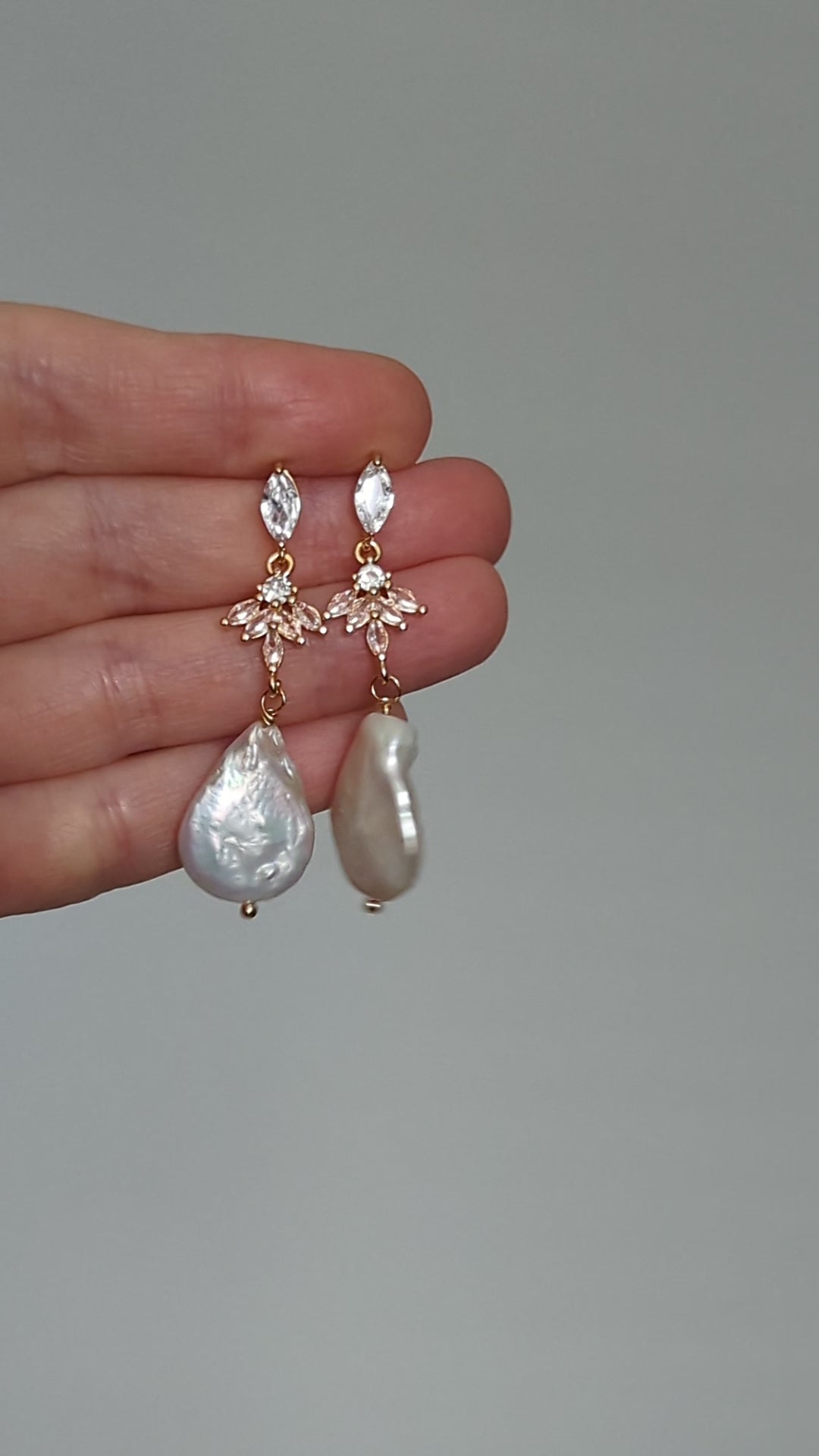 These elegant drape earrings blend style and individuality perfectly, making a bold statement. Their timeless beauty is enhanced with a modern twist, featuring CZ marquise studs, fan-shaped CZ floral connectors, and baroque pearl drops (13x18mm). Crafted with genuine cubic zirconia and lustrous freshwater pearls, they embody sophistication and are ideal for the refined yet unconventional bride. Their graceful design brings a touch of luxury and charm to any bridal look, whether traditional or contemporary. These earrings will leave a lasting impression, making them a must-have accessory for weddings and special occasions.