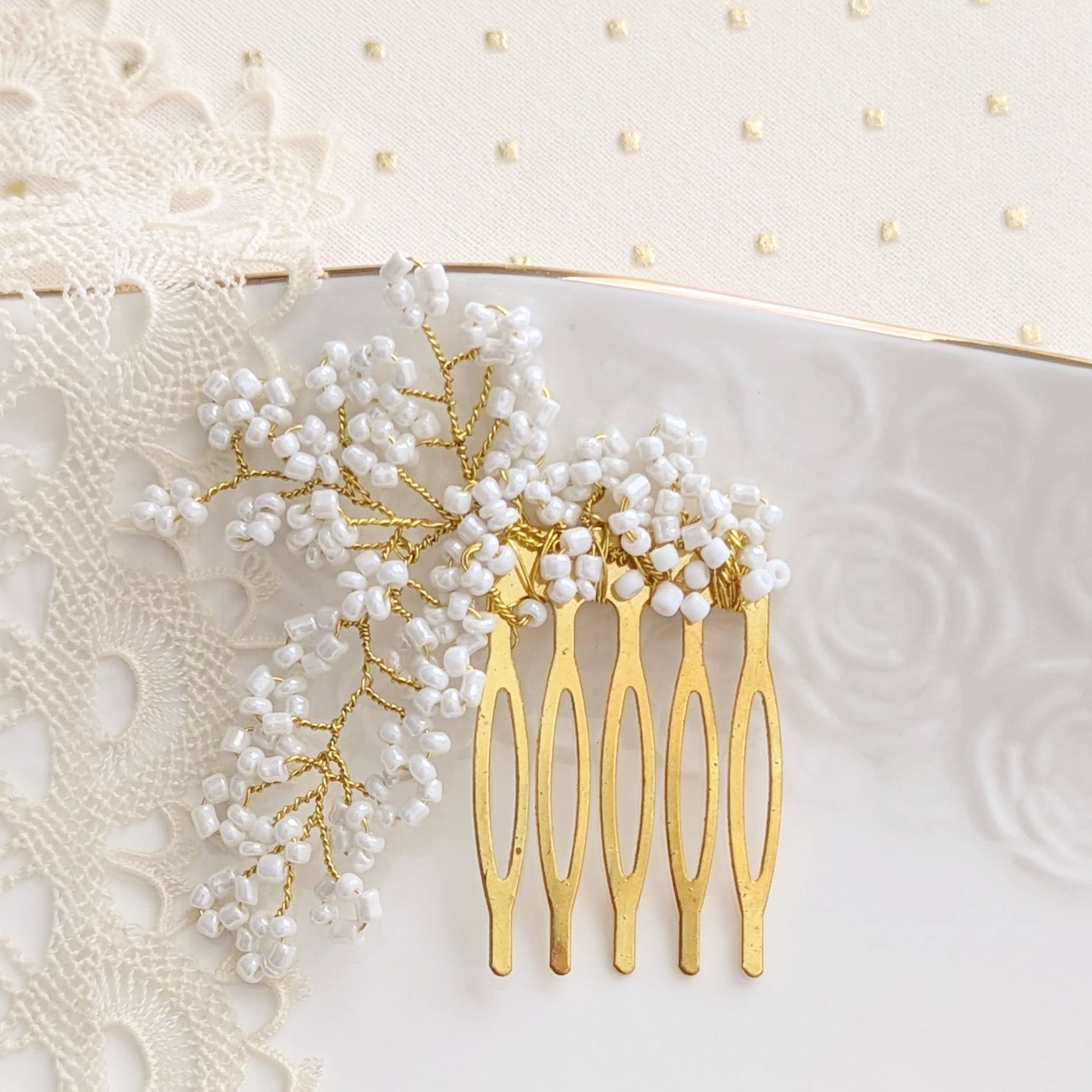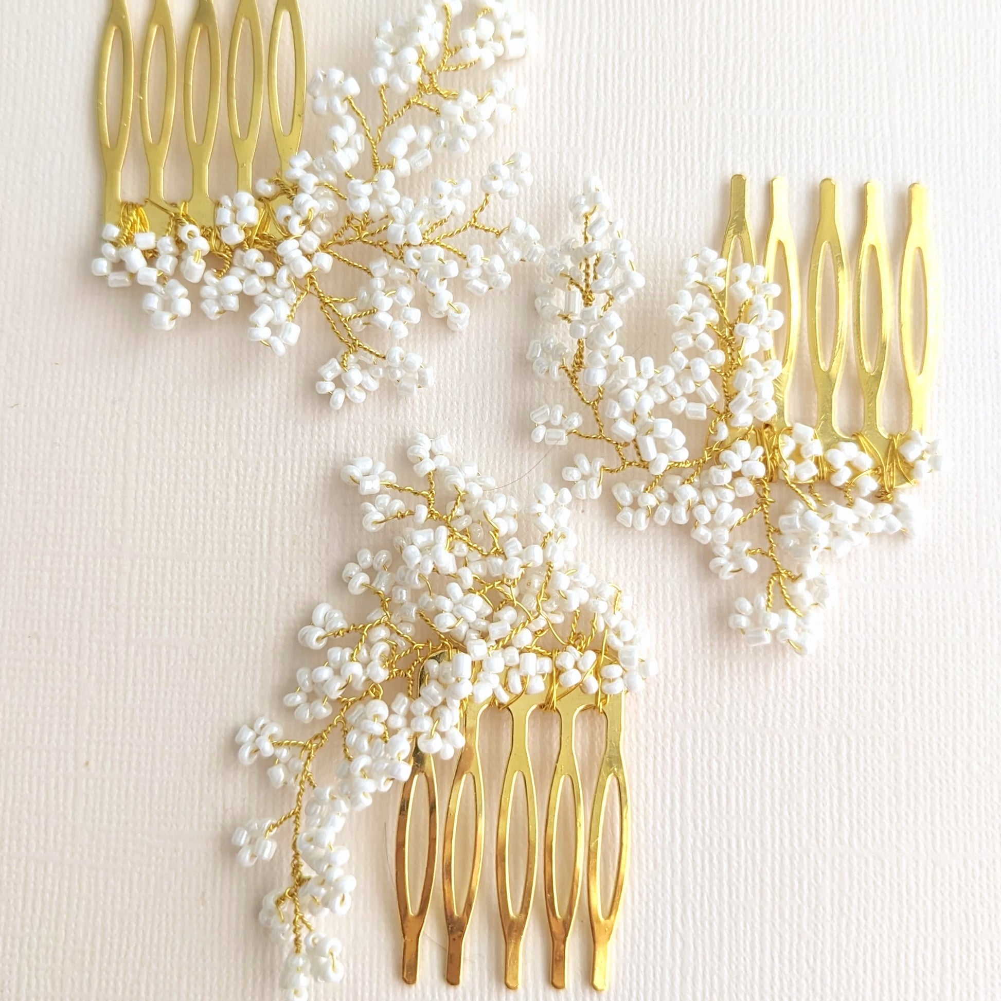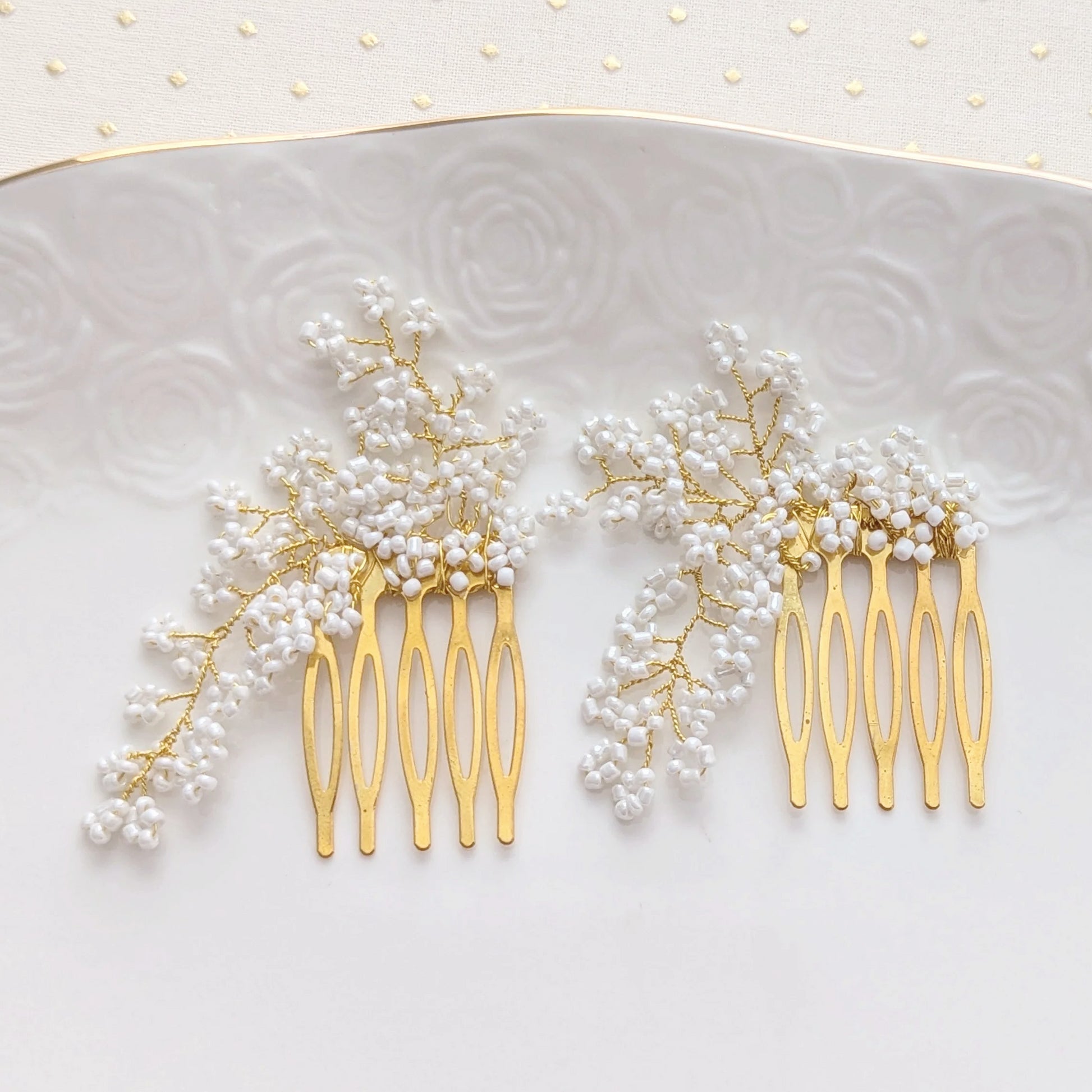 Elevate your bridal hairstyle with our stunning Gold Floral Hair Combs, meticulously handcrafted and adorned with tiny white beads. Each comb measures approximately 2" x 2 3/4", perfect for adding a touch of springtime elegance to your look. Due to the handmade nature of these pieces, the floral pattern may vary slightly, ensuring each comb is unique while maintaining the same beautiful design.