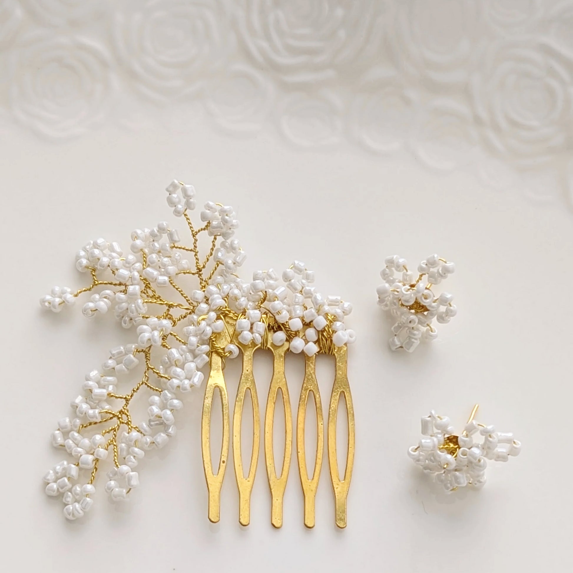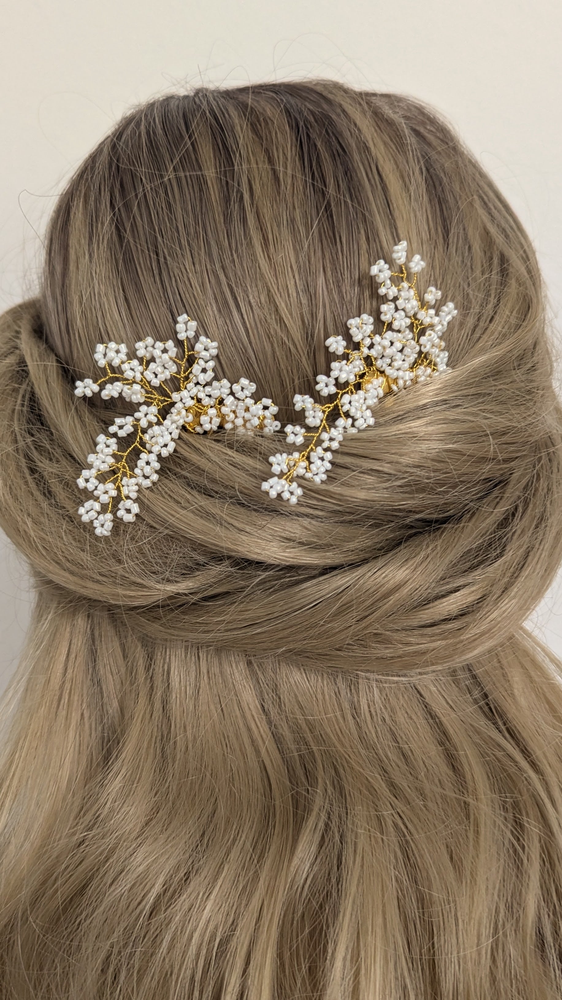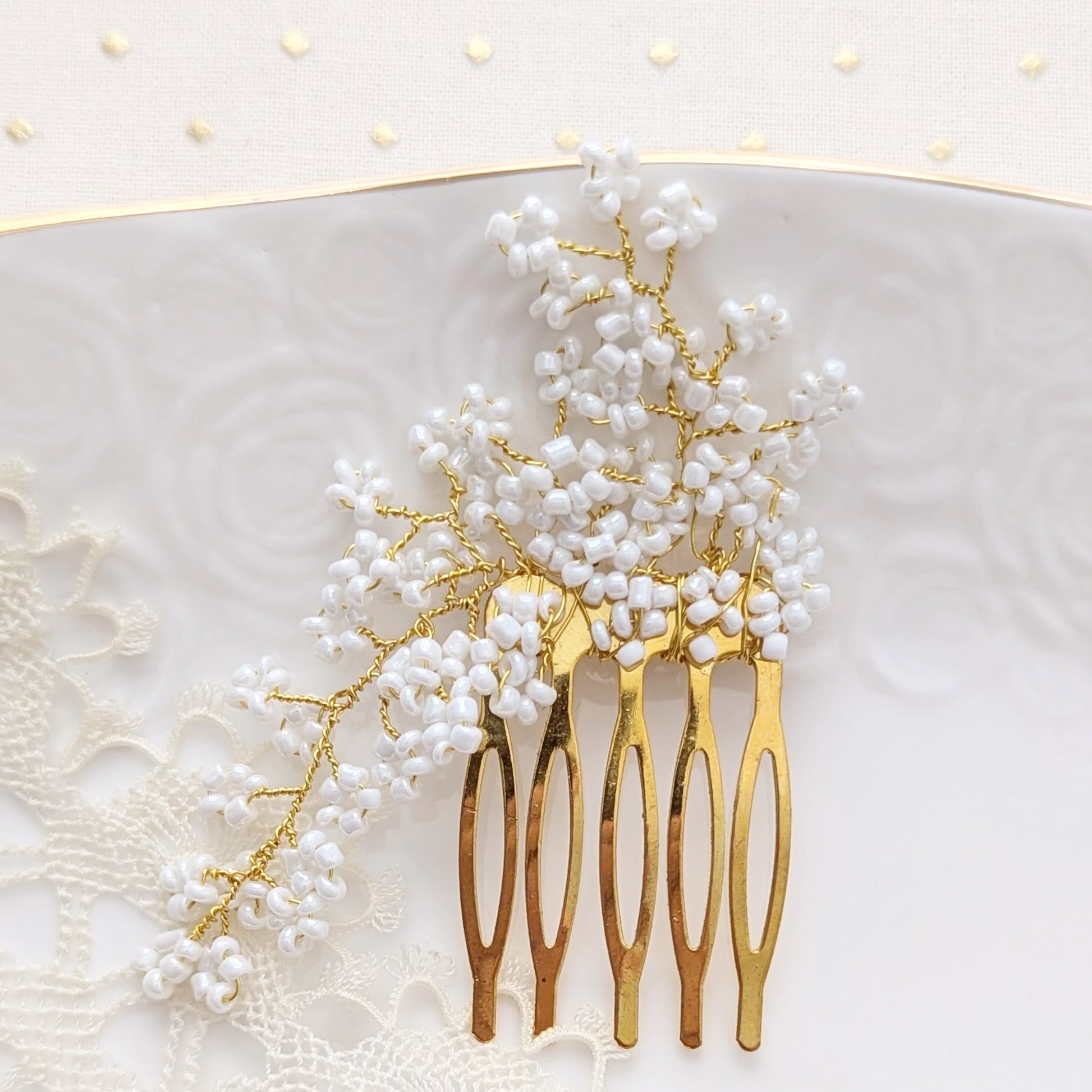 Elevate your bridal hairstyle with our stunning Gold Floral Hair Combs, meticulously handcrafted and adorned with tiny white beads. Each comb measures approximately 2" x 2 3/4", perfect for adding a touch of springtime elegance to your look. Due to the handmade nature of these pieces, the floral pattern may vary slightly, ensuring each comb is unique while maintaining the same beautiful design.