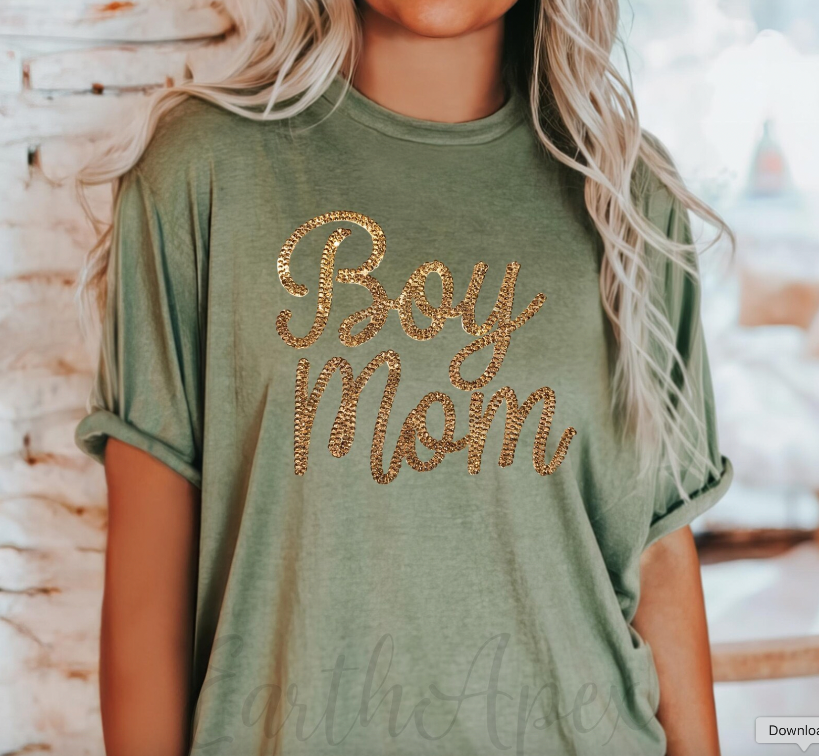This Gold Rhinestone Print T-shirt exudes a trendy and stylish vibe, perfect for boy moms looking to show off their pride in a comfortable yet fashionable way. The garment-dyed fabric and double-needle stitching ensure durability, while the relaxed fit and crew neckline make it versatile for casual or semi-formal occasions. It is ideal for Mother's Day, birthdays, or everyday wear.