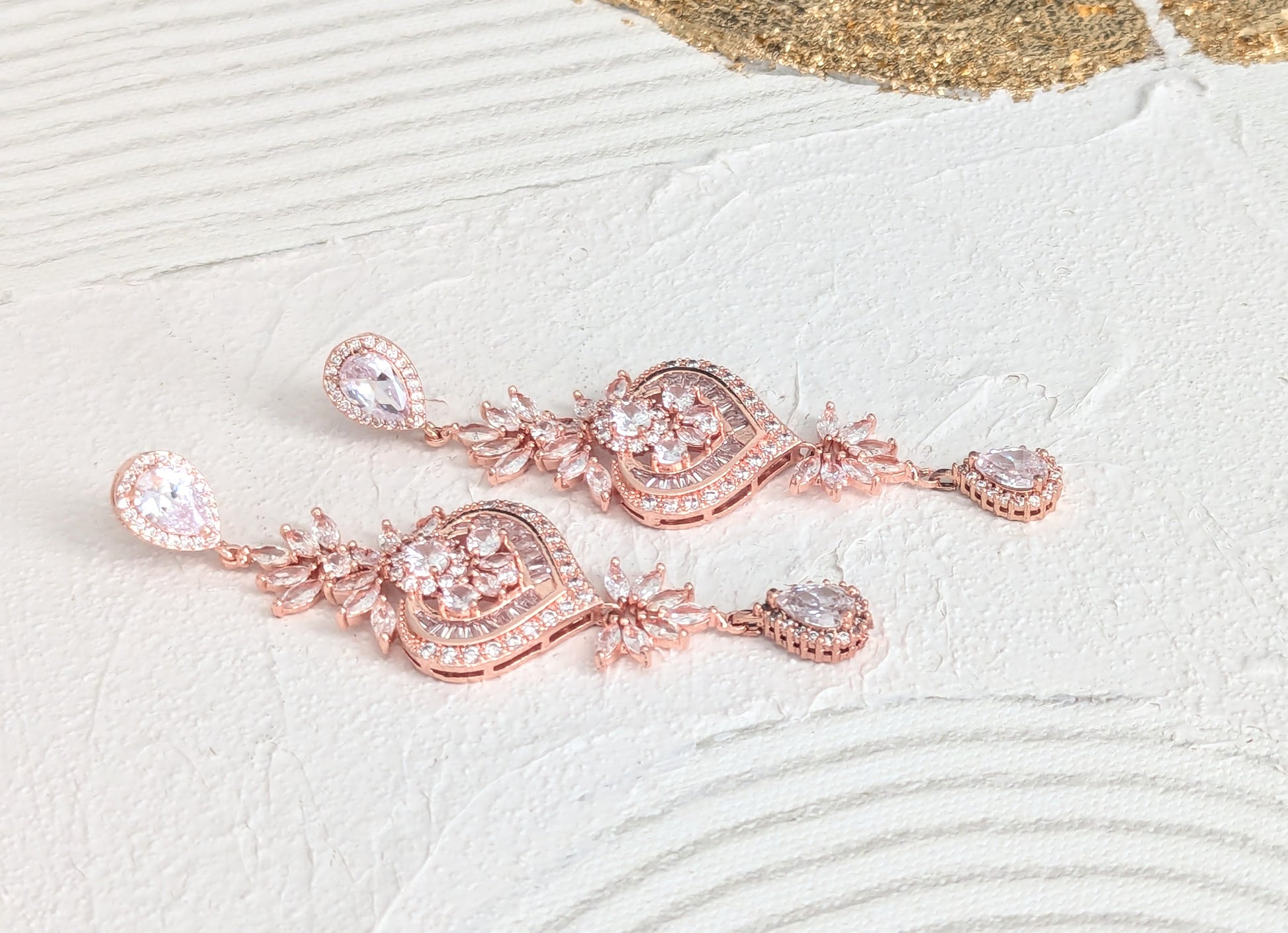 These long botanical detailed crystal bridal earrings feature marquise-shaped cubic zirconiums on rose gold or silver settings.