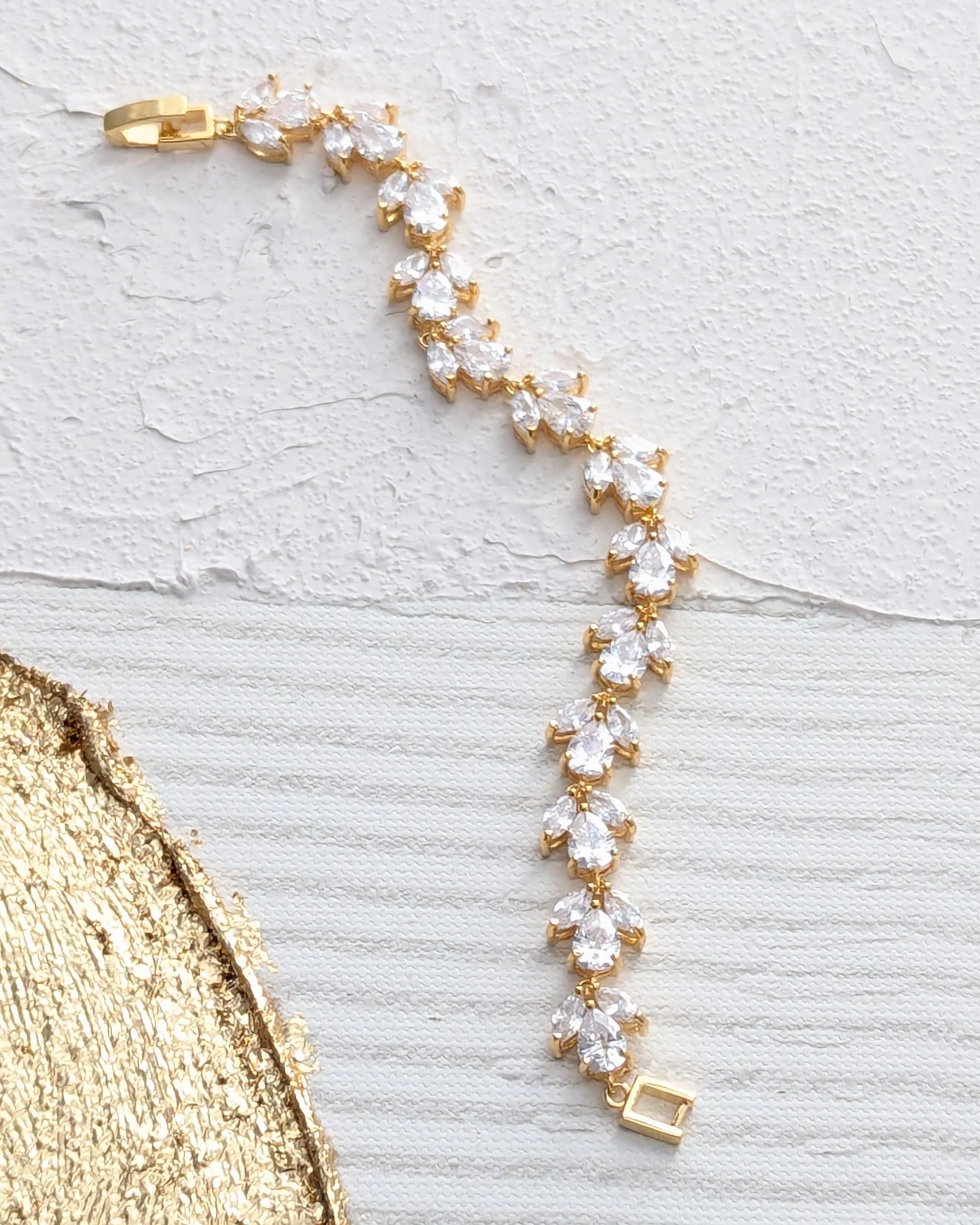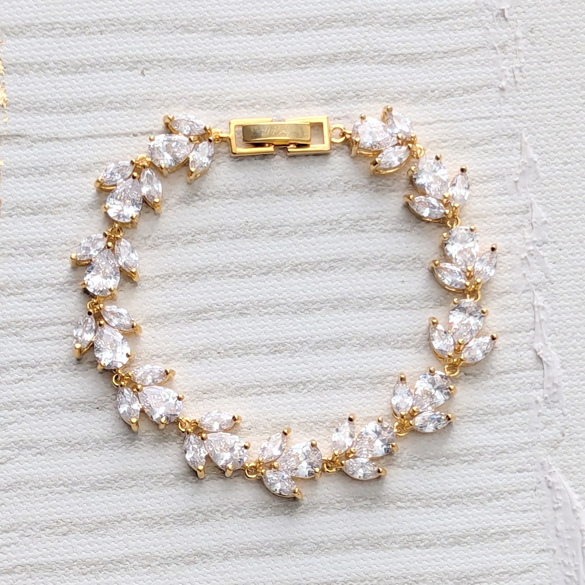 This Cubic Zirconia bracelet, adorned with marquise and drop-cut clear AAA-grade CZ stones, will add glamour to your ensemble. Expertly crafted with highly polished rhodium-plated prong settings that are lead—and nickel-free, it measures 6.6" long and features a convenient fold-over clasp. Available in silver, gold, and rose gold, this bracelet is a must-have for any special occasion.