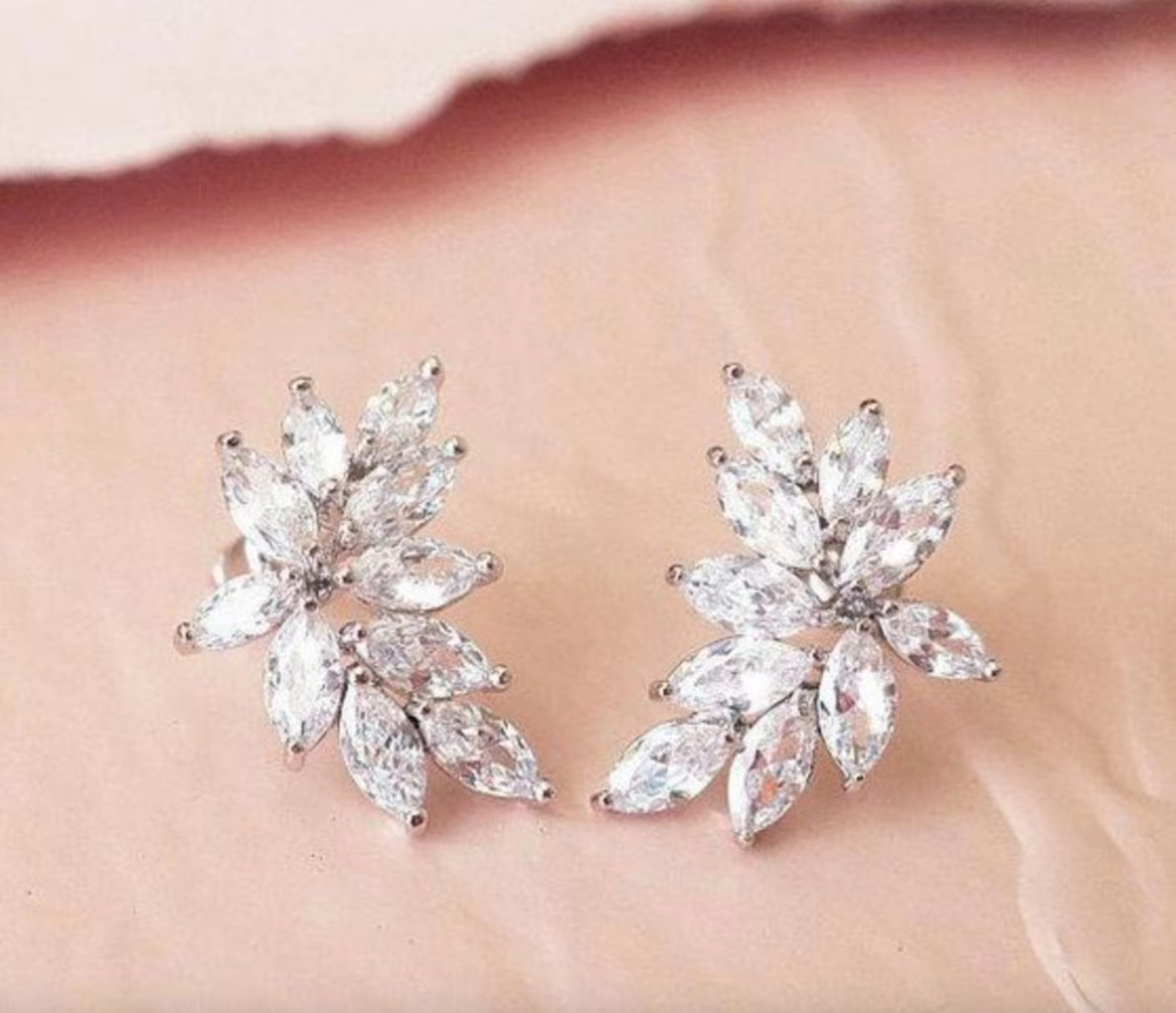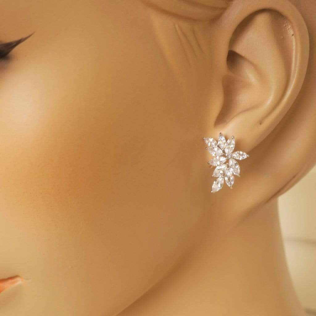 Experience elegance with our exclusive line of leaf-shaped bridal stud earrings, crafted with unrivaled attention to detail for the modern bride. These earrings feature a sleek curved design adorned with a dazzling cluster of marquise-cut Cubic Zirconia, evoking the delicate beauty of nature's foliage. With measurements of 19mm by 14mm, they strike the perfect balance between understated and bold, making them the perfect complement to your bridal ensemble without overpowering the simplistic beauty of everyday life. Elevate your wedding look with these one-of-a-kind earrings that are guaranteed to catch the light and embody the sophistication of your special day. Ideal for those who desire a touch of glamour without excessive extravagance, our leaf-inspired earrings exude luxurious minimalism that will be treasured long after you say "I do."