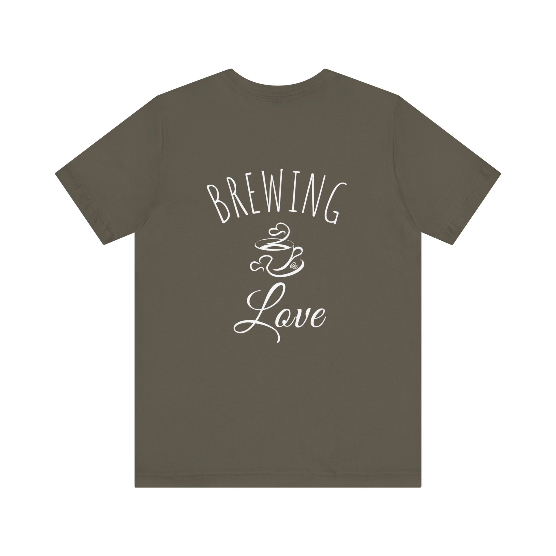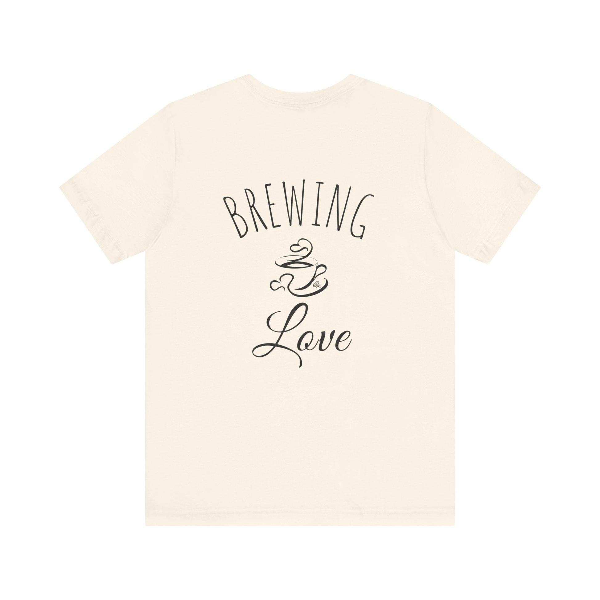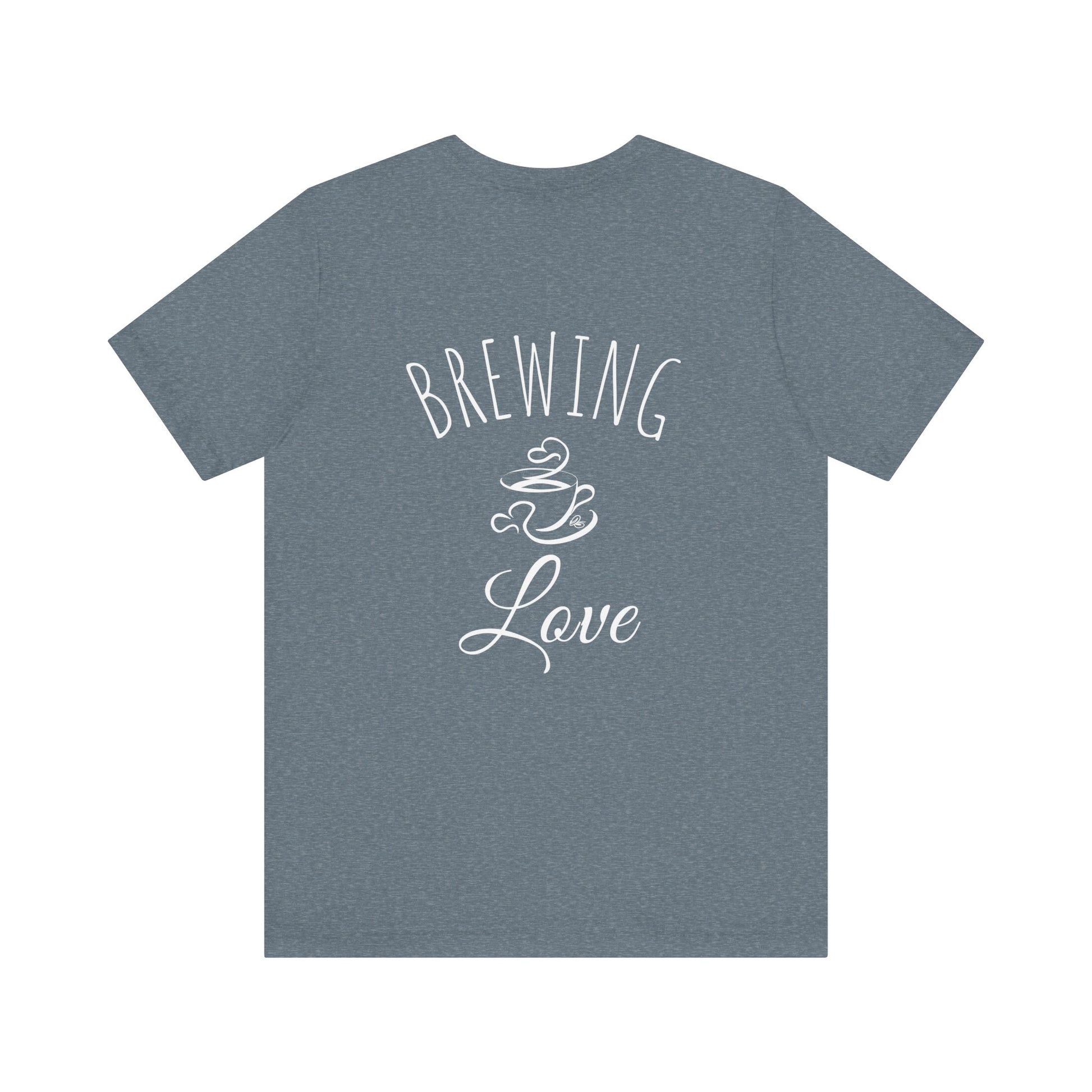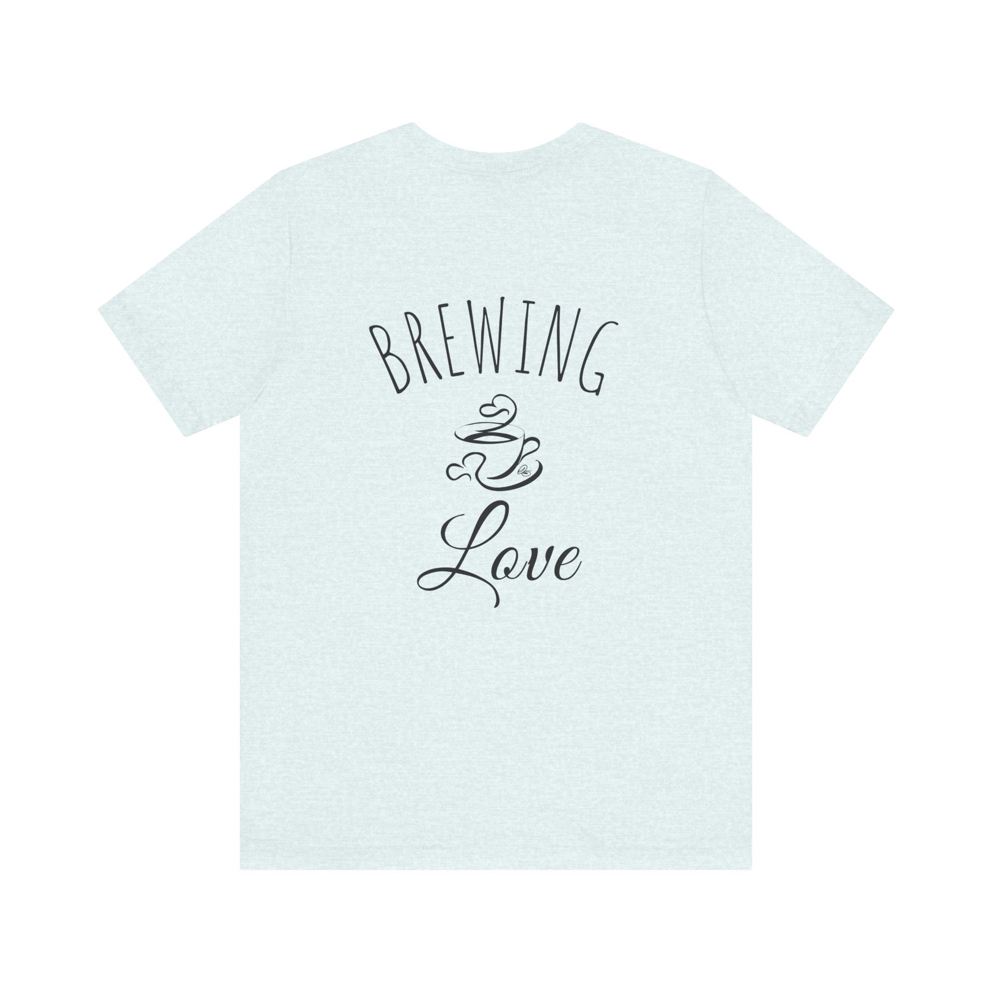 This brewing love T-shirt features a front design of wedding rings and a back design that says 'brewing love' with a coffee cup and a heart. It is perfect for coffee lovers and couples celebrating their love. It is ideal for weddings, anniversaries, Valentine's Day, and everyday wear.